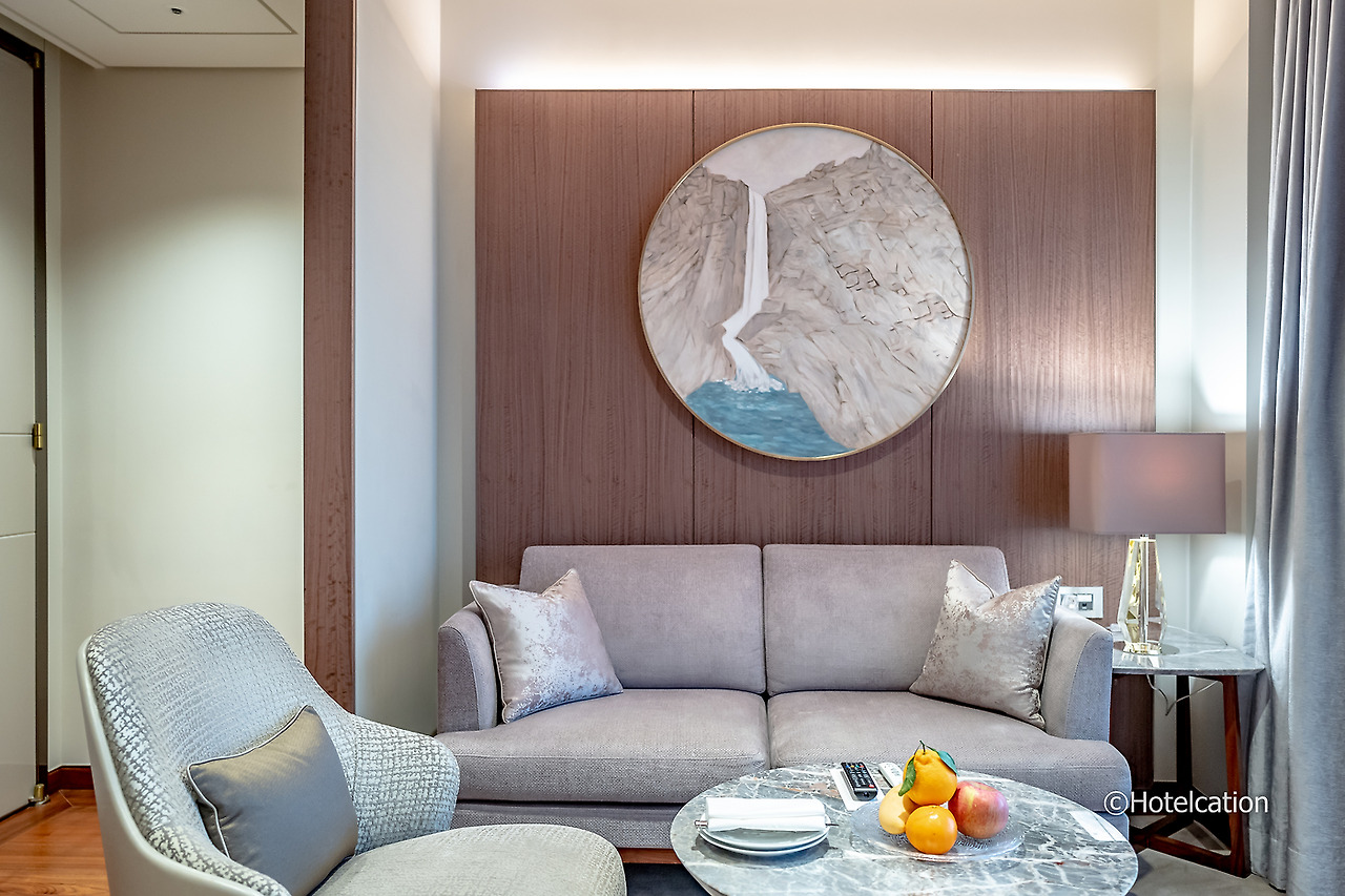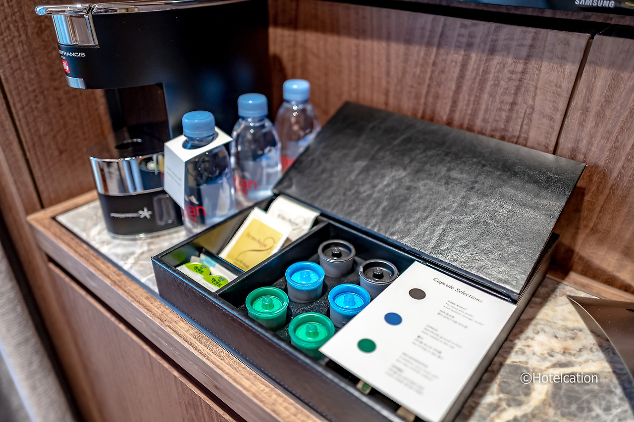 거실도 좁긴 하지만 갖출 것은 다 갖추고 있다. 소파나 테이블도 굉장히 고급스러운 편으로 투숙객에겐 무료로 캡슐 커피 등이 제공되고 기본 생수가 에비앙이다. 물론 실용적인 다양한 유료 미니바도 갖추고 있다.