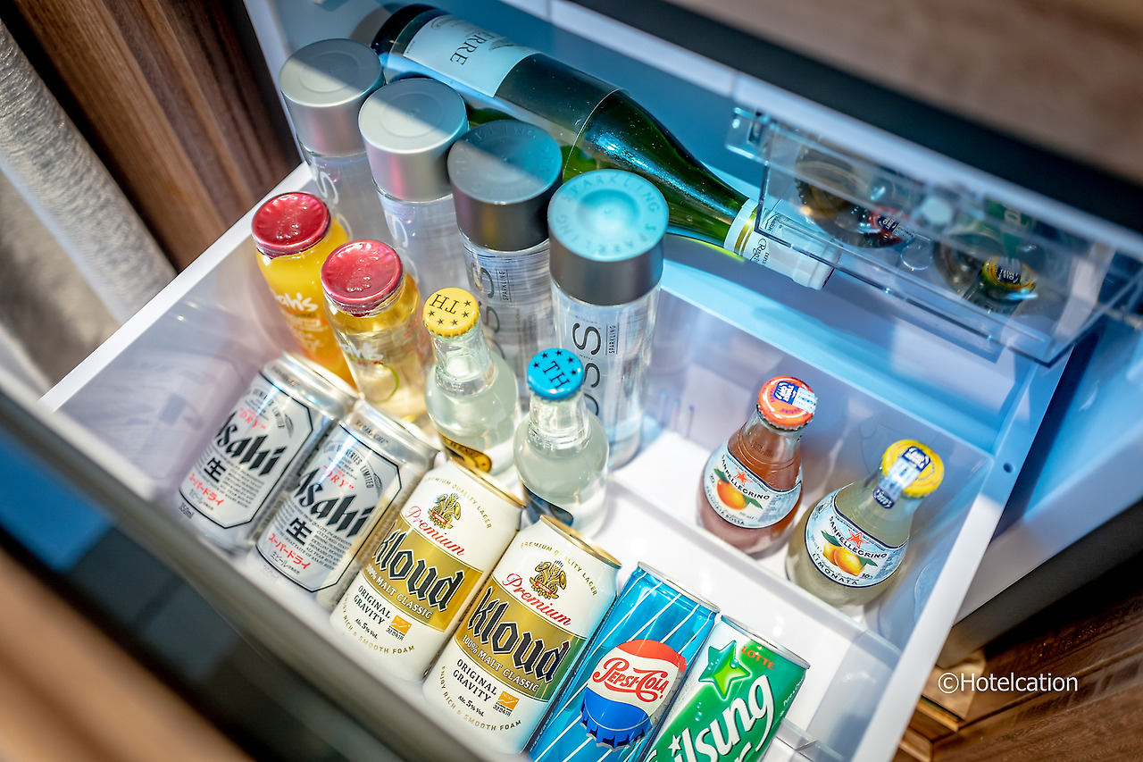 최근 호캉스 키워드로 홍보하는 많은 호텔들처럼 식사 대용으로 이용할 정도의 음식은 제공되지 않는다. 하지만 비교적 다양한 주류가 제공되는데 특히 무려 스파클링 와인 세 종류와 진짜 샴페인, 그것도 듣도 보지도 못한 브랜드가 아니라 떼땅져가 제공된다. 세상에나...