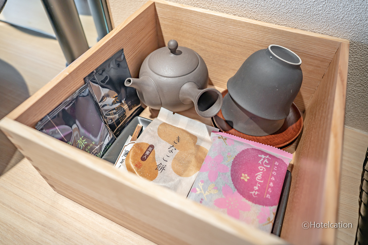 입구 쪽에는 바로 세면대가 있습니다. 생수 2병과 부족함이 없는 일회용품, 간단한 다과와 다기가 들어있습니다.