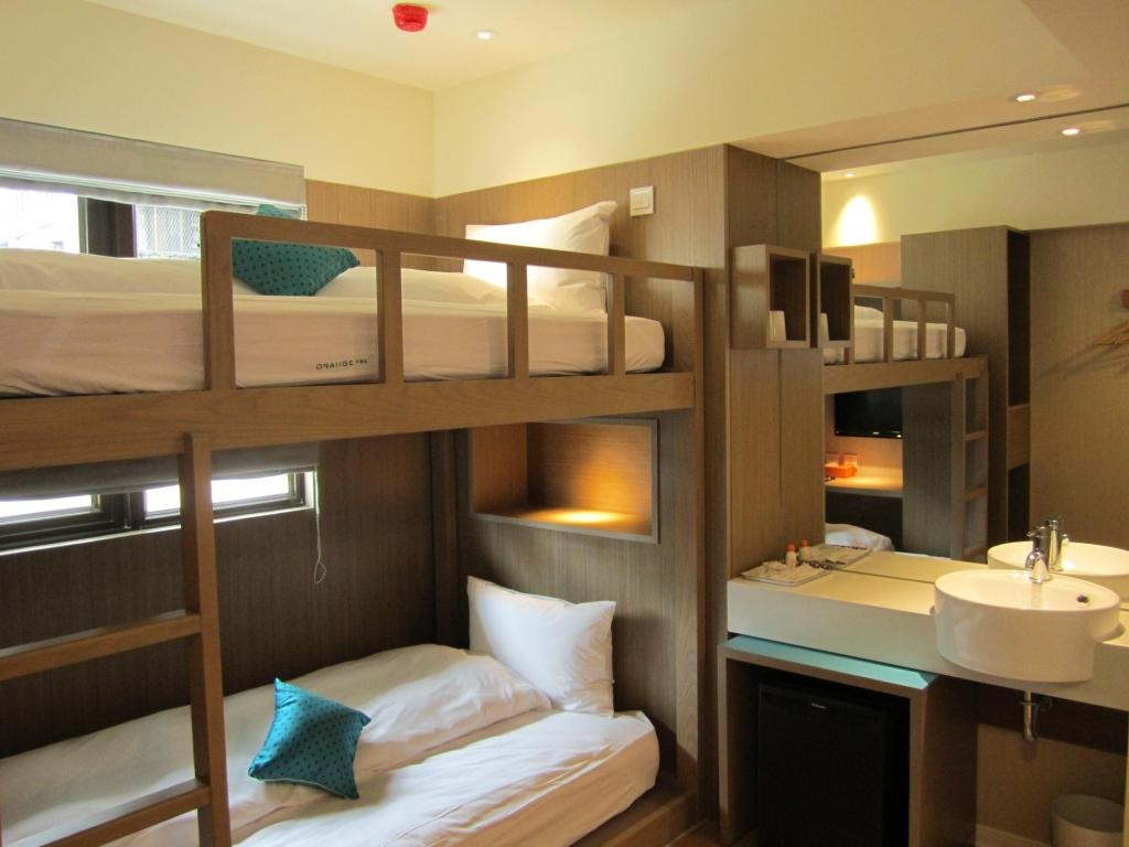 더블배드가 불편하신 분들을 위해 벙커배드로 이뤄져 있는 트윈룸이 준비되어 있어요. 벙커배드에는 개인 소품을 올려놓을 수 있도록 작은 화장대와 개별 TV까지 구비되어 있습니다. 변기와 샤워실, 세면대도 분리되어 있어 친구와 각자 씻고 준비하기에도 불편함 없는 곳이에요.