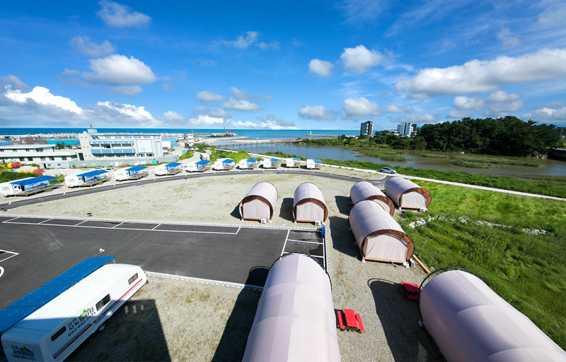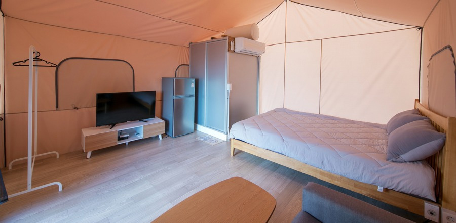 텐트와 취사도구를 준비하지 않고 몸만 가도 캠핑 느낌을 얻을 수 있는 글램핑이 요새 대세지요! 사천해변 바로 앞에 있는 포스카이 글램핑은 멋진 텐트 속에 화장실, 침대, 취사도구, 에어컨 모두 다 갖춰져 있어 마치 해리포터가 된 기분을 느낄 수 있어요!