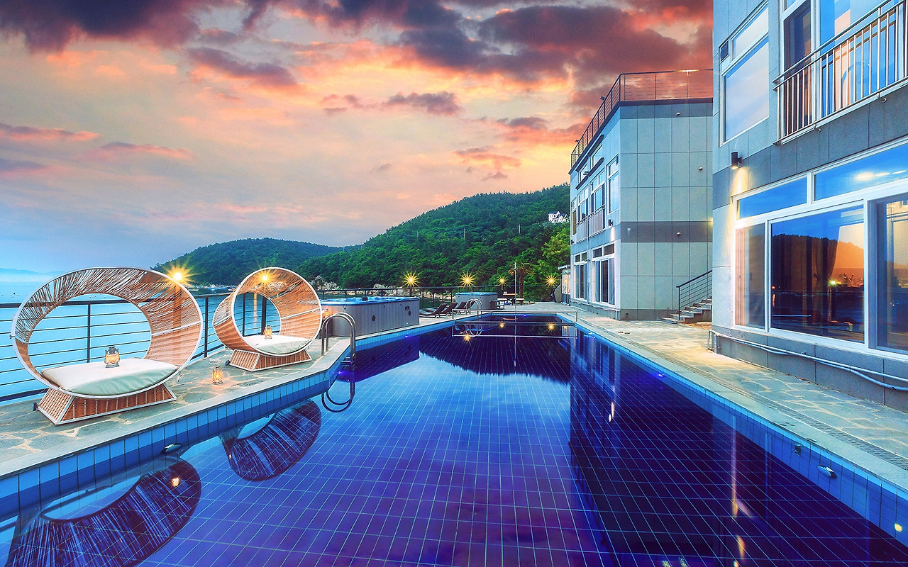 4계절 이용가능한 인피니티풀에 실내풀까지 갖추고 있는 리조트같은 펜션입니다. 넓은 수영장과 동남아에 온듯한 착각이 들게하는 야자수가 돋보이는 곳이에요. 수영장에 몸을 담그고 바다위로 지는 노을을 바라보는 건 정말 낭만적입니다. 자동차 2분 거리에 무슬목해수욕장이 위치해있습니다.
