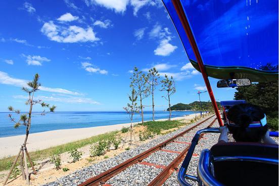 국내 유일의 해양레일바이크는 아름다운 동해의 해안선을 따라 5.4km 복선으로 운행되고 있어요. 해양레일바이크는 궁촌정거장과 용화정거장에서 각각 이용할 수 있고, 1회 편도 40~50분 소요된다고 해요.