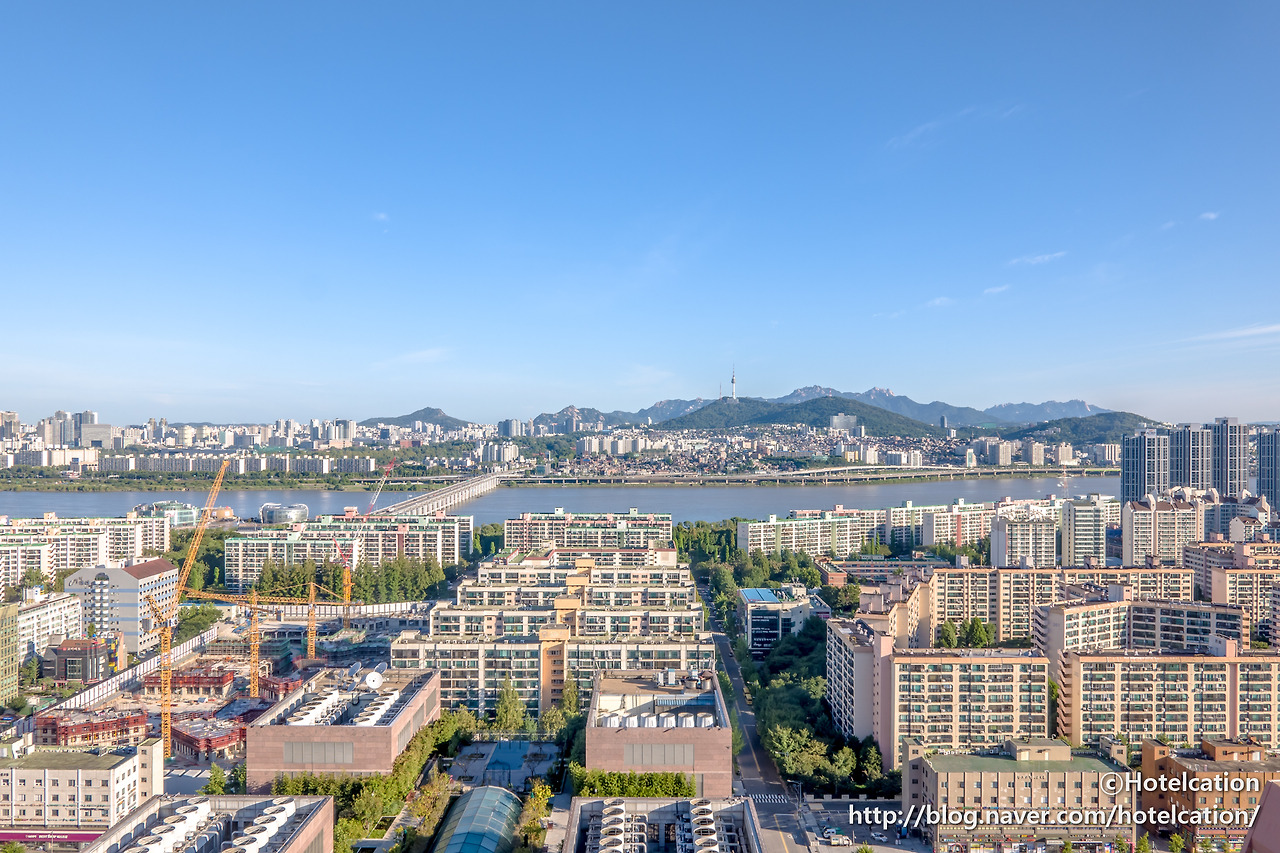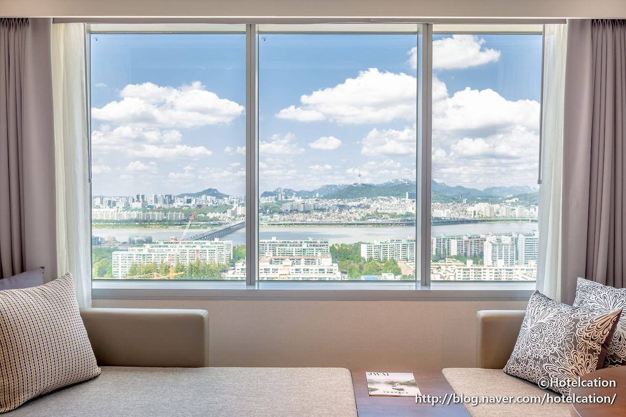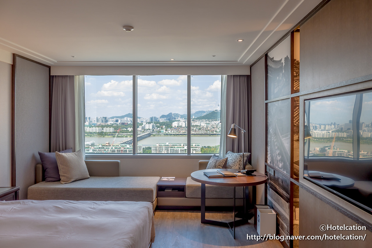 해당 투숙일에 배정받은 객실은 프리미어 뷰 룸입니다. 일반적인 한강 전망의 리버뷰 객실이라고 보면 되겠네요. 객실에 들어서자마자 보이는 시원한 한강 전망이 인상적입니다.