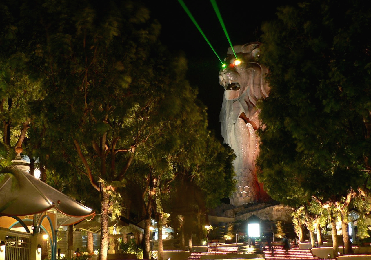 크기로는 가장 큰 멀라이언으로 비주얼도 좀 더 늠름해 보인다. 머리는 전당대로 되어있어 올라가 볼 수 있으며 밤이 되면 눈에서 레이저 빔도 나온다. 웅장한 크기와 외모 때문에 아이들이 상대적으로 덜 좋아한다고 하는 소문도 있다. 주변에는 수족관과 유니버설 스튜디오 싱가포르 등 가족끼리 즐길 수 있는 다양한 어트랙션을 보유하고 있다.