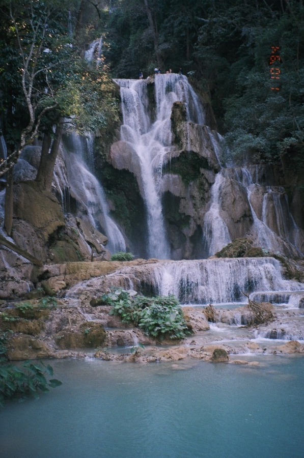 루앙프라방은 골목 곳곳에 여행사가 많은데요. 그중에 한 곳을 선택해서 꽝씨폭포 배와 미니밴을 예약했어요. 시원한 폭포가 쏟아지고 있고, 에메랄드 물에서 물놀이도 가능해요.