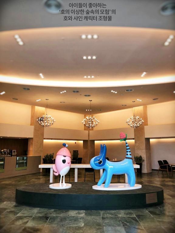 패밀리형 리조트답게 로비에 들어서면 아이들이 좋아하는 캐릭터 조형물이 반겨요. 이용객들의 편의를 위해 마련된 카페테리아와 매점에서는 정선 특산물 구매도 가능하니 살펴보세요.