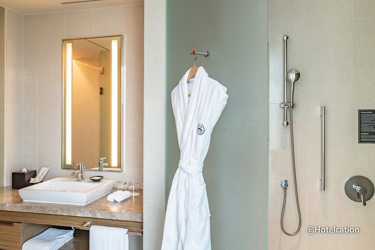 쉐라톤 디큐브시티는 다양한 객실 모습처럼 욕실도 객실마다 차이가 큽니다. 욕조가 있는 객실, 없는 객실이 있고 세면대가 비교적 좁은 객실도 있습니다. 제가 이번에 받은 객실은 사우나 겸 샤워실이 있네요.