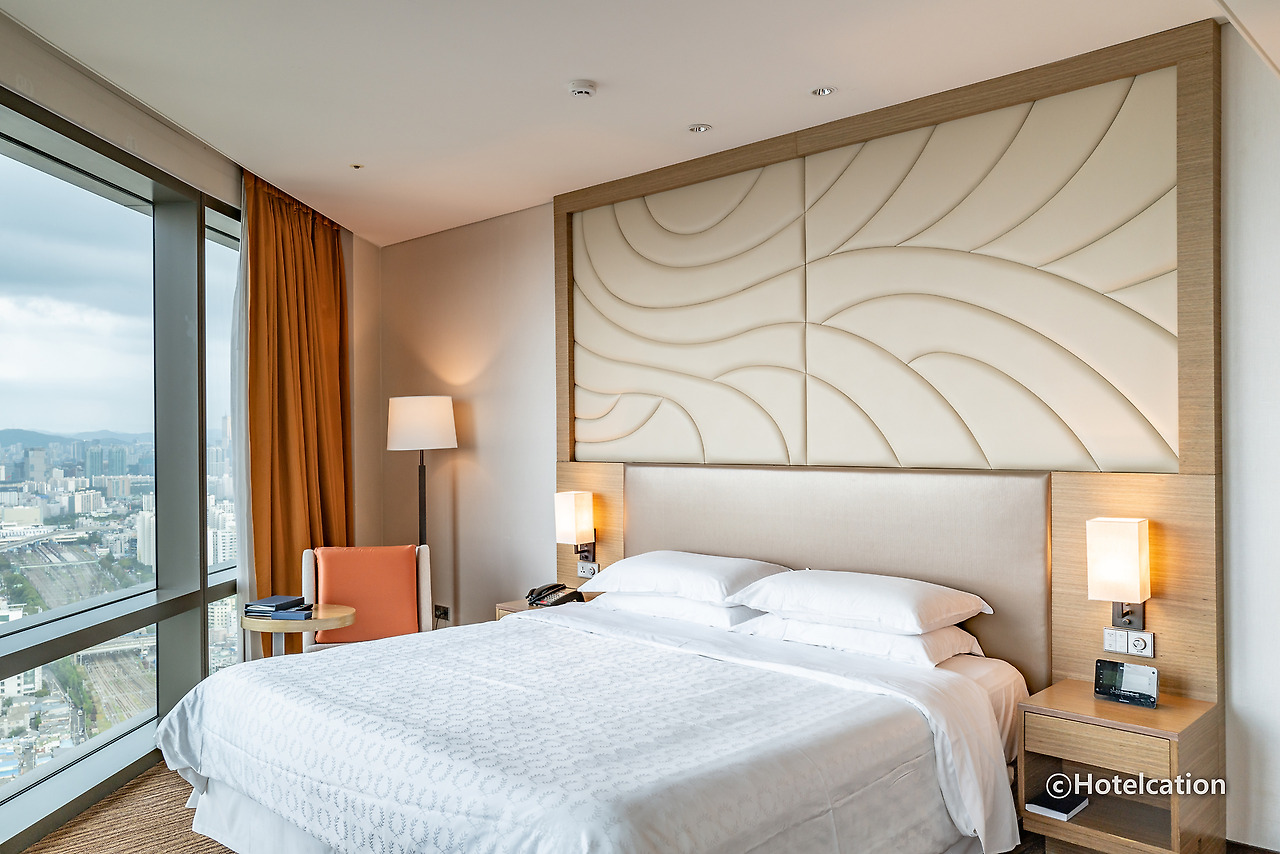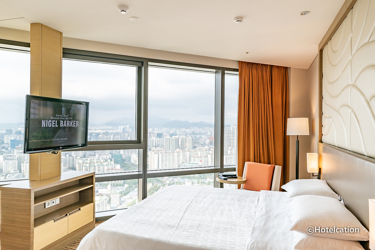 쉐라톤 디큐브시티는 건물 구조가 특이해서 객실마다 모습이 상당히 많이 다릅니다. 이번에 소개해드릴 객실은 코너 쪽에 위치한 객실로 그래도 일반 객실 중에서는 가장 훌륭한 전망, 개방감을 가지고 있는 객실입니다.