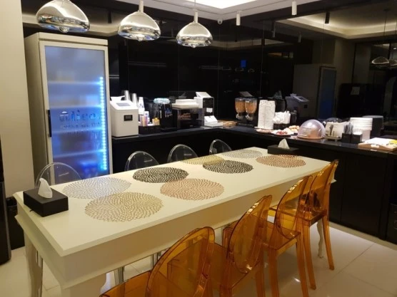 맛있는 음식을 먹을 수 있는 깔끔한 식탁과 간단한 음료 바가 준비되어 있어요. 작지만 알찬 구성! 조식 (7시~9시)으로는 간단한 라면을 제조해서 먹을 수 있고, 이외에도 토스트 시리얼 등으로 아침을 떼울 수 있도록 준비해두었어요.