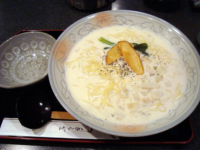 감자와 양파, 그리고 조개로 걸쭉하게 만들어낸 크림소스 베이스의 라멘! 뭔가 클램 차우더 같기도 까르보나라 같기도 한 이 오묘한 맛은 원샷각이 분명하다.
