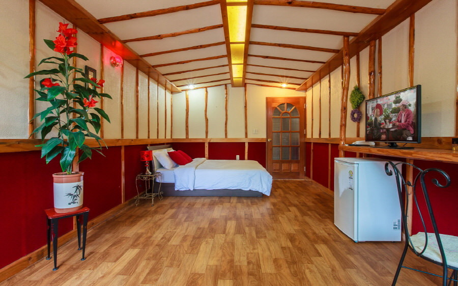 대표 객실로 국화방 203호이다. 원룸 형태로 되어 있지만 넓어서 가족 단위의 여행객들도 머물기 좋은 객실이다. 정원처럼 안고 있는 연리지 숲을 감상할 수 있으며, 객실 내 테라스에서 바비큐 파티를 할 수 있다.