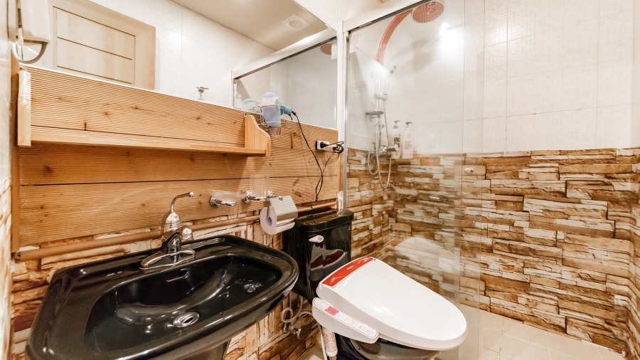 샤워 공간이 따로 분리되어 쾌적하게 화장실을 이용할 수 있다. 휴지와 치약, 비누, 수건 등 기본적인 욕실용품을 제공해주고 있다. 단, 개인 용품은 가져오도록 하자.