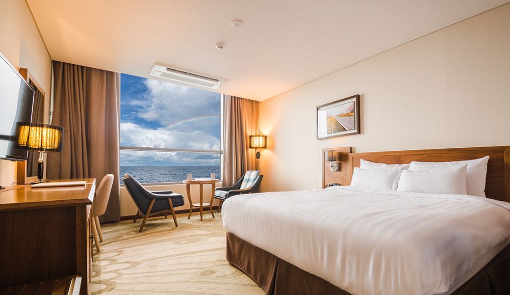 체크인은 15:00부터, 체크아웃은 11:00까지. 로비에 있는 프런트 데스크는 24시간 운영되고 짐 보관 서비스도 운영 중이다. 객실은 깔끔한 인테리어와 넓은 창문 넘어 보이는 오션뷰가 환상적이다. 객실 내 냉장고, 티포트, 컵 등이 구비되어 있고 무료 생수는 1일 2병씩 제공된다. 욕실 어메니티로는 샴푸, 린스, 바디워시, 면봉, 빗 등이 준비되어 있고 1회용 칫솔과 면도기는 별도로 판매되니 미리 챙겨오는 것을 추천!