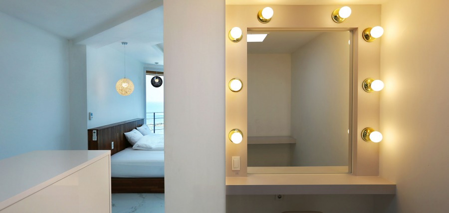 욕실에는 샴푸, 컨디셔너, 샤워젤이 구비되어 있어 편리하다. 그리고 에디터 마음에 쏙 들었던 LED 조명이 부착되어 있는 화장대! 밝고 환한 화장대에서 꼼꼼히 컨디션을 체크할 수 있어 좋다.