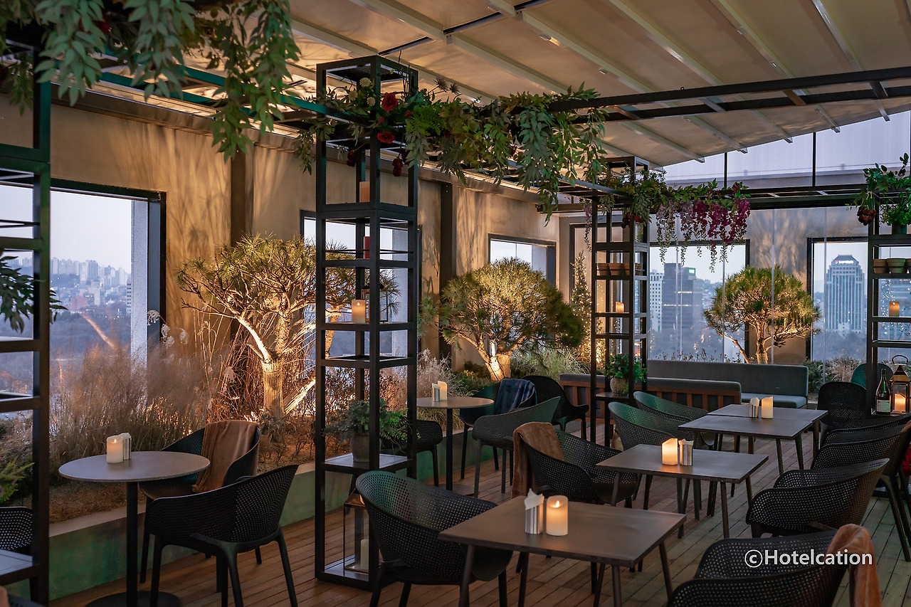 반대쪽에 멋진 테라스 공간도 있는데요. 저녁이나 우천시에는 위에 지붕을 닫아 더욱 분위기 있는 공간으로 변신합니다. 어렴풋이 창문으로 보이는 익선동 한옥거리도 운치있네요.