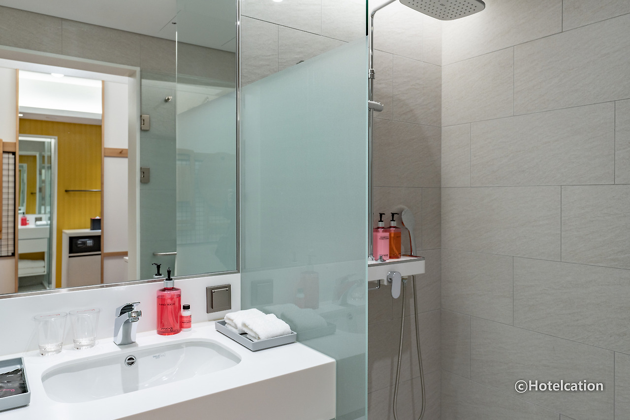 객실 자체가 크지 않아 화장실 공간도 큰 편은 아닙니다만 샤워실 공간은 넉넉하게 배치했네요.