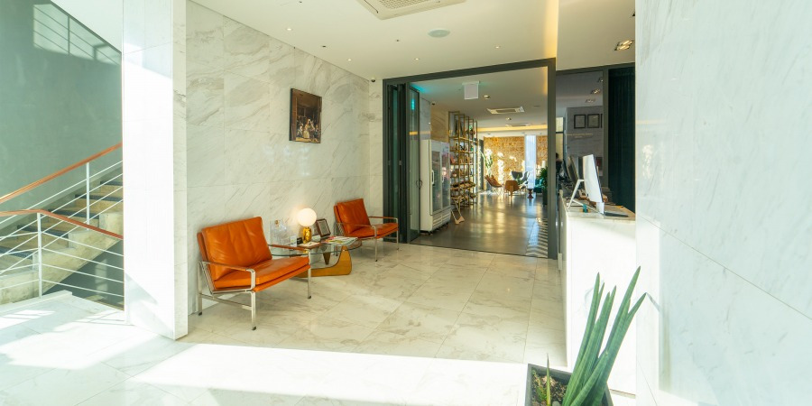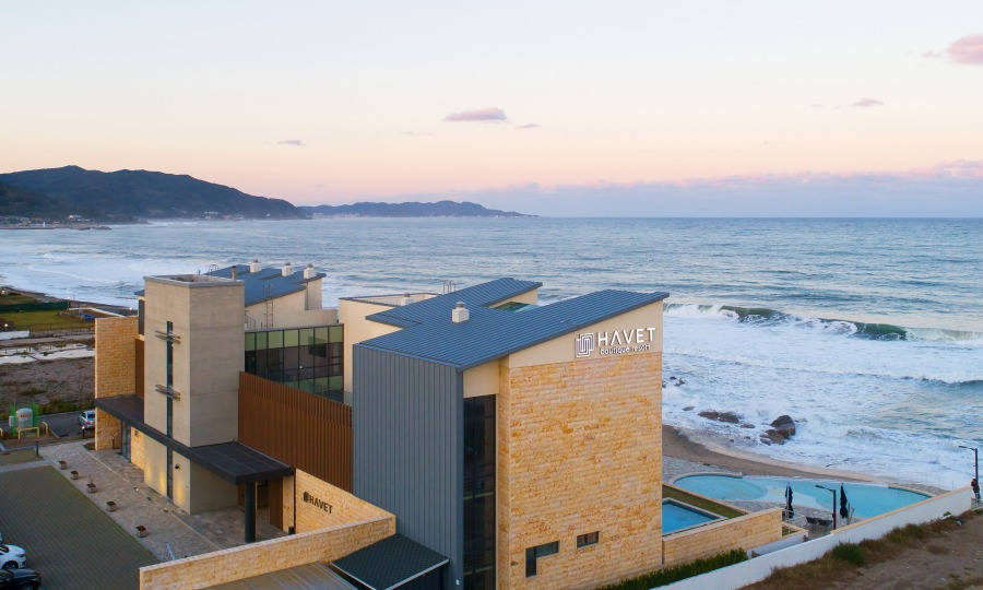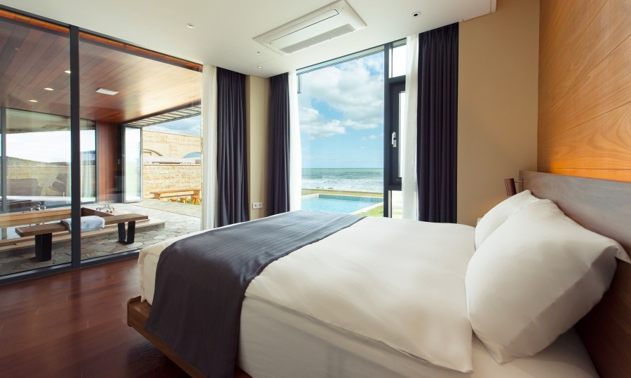 이집트에서 공수해온 써니 베이지 스톤을 하나하나 조각해 쌓아 올린 외관은 딱 보기에도 이국적이다. 실내는 대리석과 메탈릭한 소재를 포인트로 한 스칸디나비안 스타일로 “정말 여기 한국 맞아?”라는 느낌이 든다. 리조트 내 모든 투숙객이 이용할 수 있는 두 개의 풀이 있다. 중정풀은 상수도, 해수풀은 바닷물을 사용하고 있다.