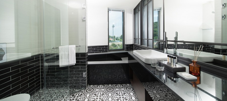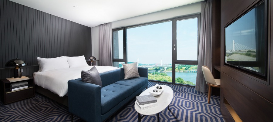 더블 디럭스 룸은 아라뱃길이 한 눈에 들어오는 멋진 뷰를 가졌다. 객실은 세련되고 차분한 모노톤으로 이루어져 편안한 휴식을 돕고 지은지 얼마되지 않아 깨끗하고 쾌적한 시설을 누릴 수 있다. 욕실용품을 비롯해 칫솔과 치약세트, 면봉과 화장솜 등 어메니티는 빠짐없이 준비되어 있어서 홀가분한 마음으로 호캉스를 즐길 수 있다.