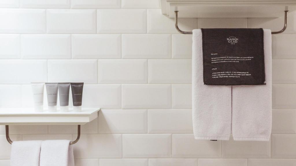 객실은 전체적으로 모던한 분위기를 풍긴다. 티 테이블과 의자가 있어서 여행 마무리 후 시간을 보내기도 좋고, 침대 바로 옆 콘센트나 USB 충전기 꼽는 공간이 있어서 편리하게 이용할 수 있다. 메종 글래드 제주 어메니티는 자체 제작 브랜드 구성돼 있는데 샴푸, 컨디셔너, 바디워시, 비누, 클렌징 패드 그리고 칫솔도 준비돼 있다. 헤어드라이어는 메종 글래드 제주 파우치에 세심하게 담겨 있다.