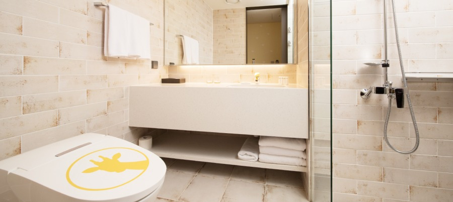 화사한 노란색의 지라프 룸은 딱딱하지 않은 분위기의 룸에서 아이들도 편안하게 지낼 수 있을 것 같다. 침대는 더블+싱글이 합해진 맘모스 침대로 아이와 함께 지내기에 넉넉하다. 방마다 50개의 채널이 나오는 43인치 TV가 설치 되어 있다. 욕실에는 고급 어매니티가 세팅되어 있다. 욕실에 구비된 칫솔 외에 칫솔이 더 필요할 시에는 2,000원 추가 지불해야 한다.