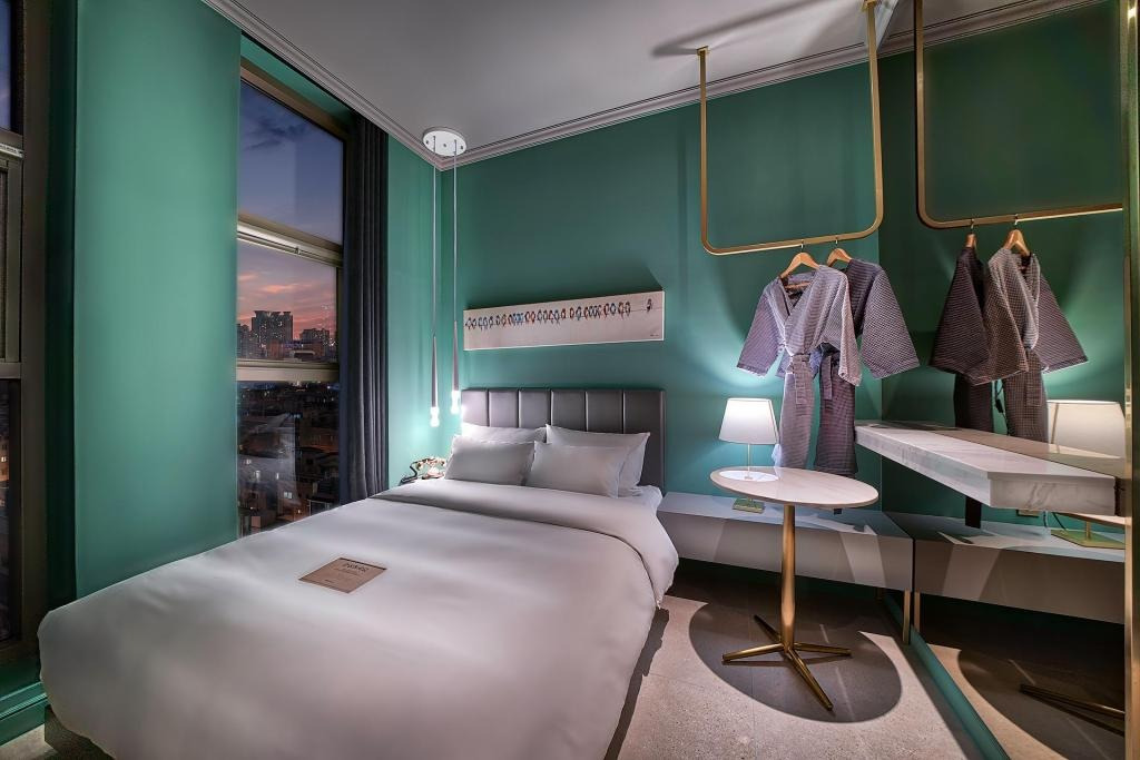 영화 ‘그랜드 부다페스트 호텔’에서 영감을 받은 화려하고 이국적인 인테리어가 돋보인다. 고급스러운 유럽풍의 객실은 세면대가 욕실과 분리되어 건식으로 더욱 편리하게 사용이 가능하다. 욕실에는 샴푸, 컨디셔너, 바디워시, 칫솔과 치약, 그리고 토너와 로션, 바디로션까지 꼼꼼히 구비되어있는 데다 수건도 넉넉히 있다.