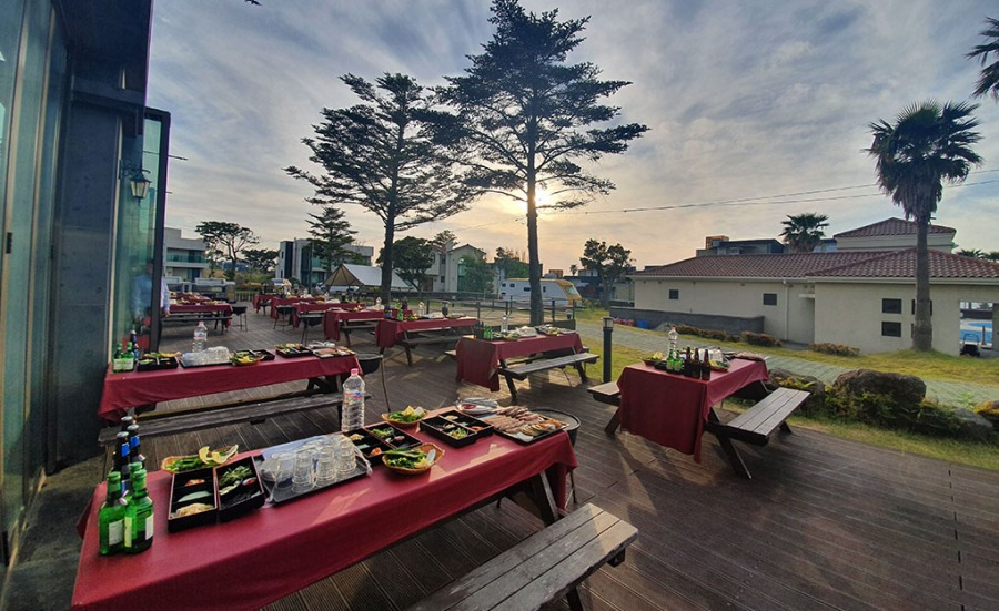 야외 BBQ장에서 밤하늘의 달과 별을 보며 낭만적인 추억을 쌓을 수 있다. 식재료는 리조트에서 살 수 있는데, 제주 돼지 오겹살/목살 200g, 전복, 새우, 공깃밥, 국, 밑반찬 등이 제공되며, 요금은 3만 5천 원이다.