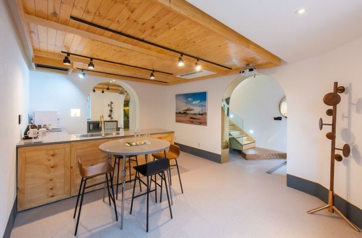 어포스트로피라는 카페에서는 아름다운 바다를 보며 차 한잔 하는 휴식 시간도 가질 수 있다. 피톤치드 가득한 히노끼 사우나도 있다. 바베큐 서비스는 2인 기준 8만원에 대여가 가능하다. 왕새우, 특 등급 전복, 돼지 목살, 모듬 소시지, 감자, 버섯, 양파, 유기농 야채 쌈, 반찬, 소스 등이 포함돼 신청해도 후회 없을 듯! 넓은 부지에 여러 동의 건물이 있는 구조로 총 6개의 건물과 2개의 풀이 있다.
