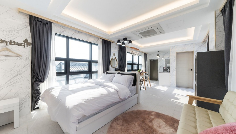무엇보다 모사금 해수욕장의 푸른 바다와 끝도 없이 이어진 하늘이 통 유리창을 통해 한 눈에 들어온다. 이 자체만으로도 힐링이 되는 기분이다. 잠을 자기 아까울 정도로 최고의 오션뷰를 자랑한다! 어메니티도 물론 제공한다. 샴푸, 컨디셔너, 바디워시, 바디로션이 제공된다. 호텔처럼 로비가 잘 갖춰져 있어 체크인, 체크아웃은 물론이고 주변 여행지나 이용에 필요한 부분을 상시적으로 안내받을 수 있다.