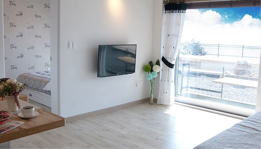 거실과 침실, 욕실, 테라스로 공간이 분리되어 있으며, 전자레인지, 인덕션, 전기밥솥, 조리도구 일체가 준비되어 있어 조리가 가능하다. 체크인은 15시부터, 체크아웃은 11시까지.