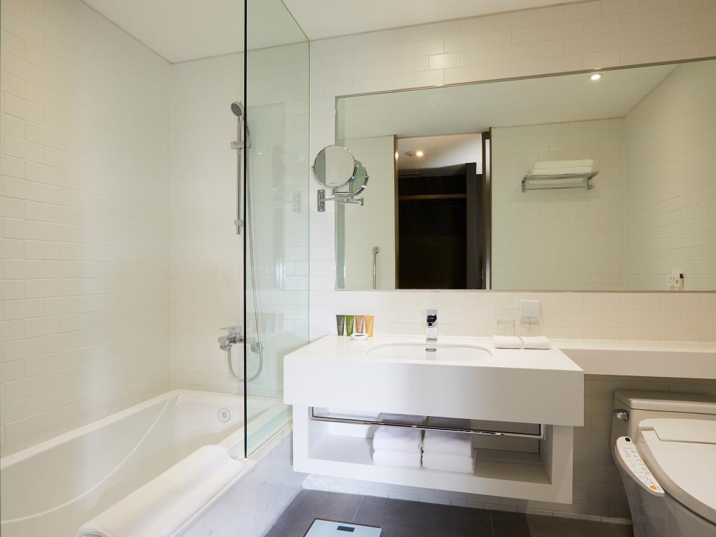 깔끔하고 꽤 널찍하게 빠진 욕실은 욕조에 샤워부스가 설치되어 있어 좁은 공간을 효율적으로 사용했다. 어메니티는 자체 제작한 글래드 제품으로 샴푸, 컨디셔너, 바디샤워, 클렌징 패드, 면봉, 비누가 제공된다.