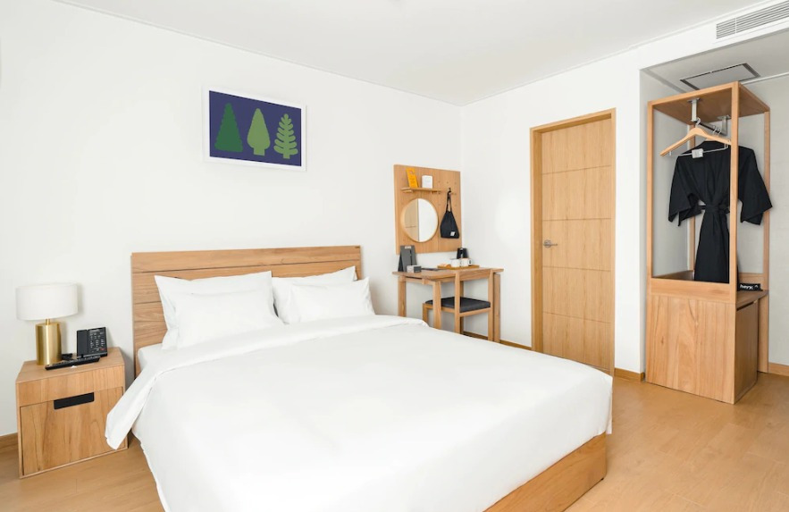 헤이 서귀포는 여행객이 편하게 쉴 수 있도록 기획된 호텔이다. 인테리어는 감각적이면서도 모던하여 깔끔하다. 1층엔 북카페 공간, 자전거 대여 가능, 굿즈 판매를 판매하고 있다. 프런트 운영 시간 7시부터 저녁 12시까지이니 이점 참고하시면 될 것 같다. 해동은 바다가 보이는 뷰이고, 산동은 산이 보이는 뷰이다. 원하시는 뷰를 선택하시면 직원분이 객실을 추천해준다. 객실 내부는 원목 인테리어로 깔끔하고, 매트리스 위에 라텍스 토퍼가 있으며 좋은 숙박연구소 브랜드로 꿀잠은 보장이다.