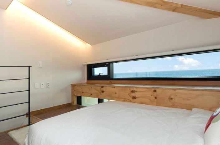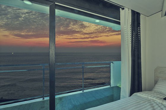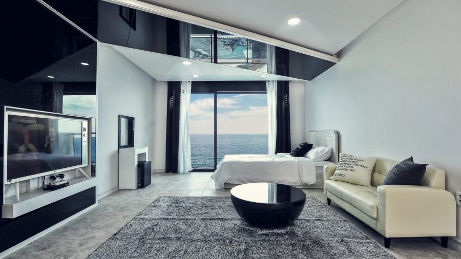 객실은 블랙&화이트로 모던하고 현대적으로 꾸며져 있다. 객실 크기도 큰 편! 통유리를 통해 한 눈에 들어오는 바다 전망이 특징인 곳으로, 방에서 일출부터 노을까지 모두 즐길 수 있다.