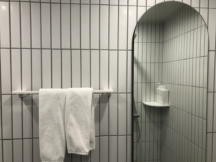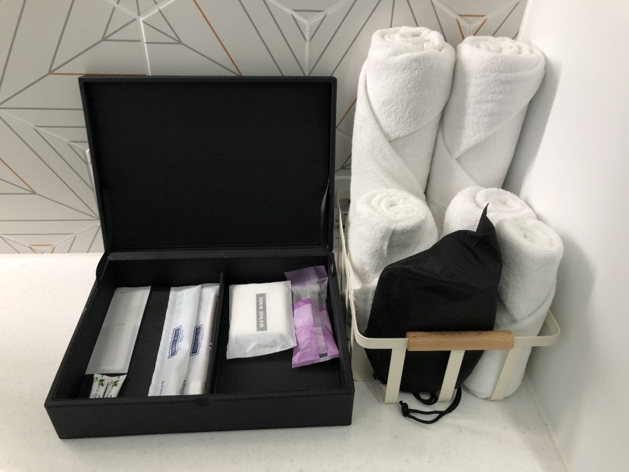 세면대를 건식으로 사용할 수 있어 편리했고 거울에 따로 조명이 들어와 화장할 때 정말 좋았다! 어메니티 박스 안에는 칫솔과 치약, 바디 스펀지, 면도기, 빗 등이 준비되어 있다. 젖은 옷이나 수영복을 말릴 수 있는 건조대도 있어 유용하다.