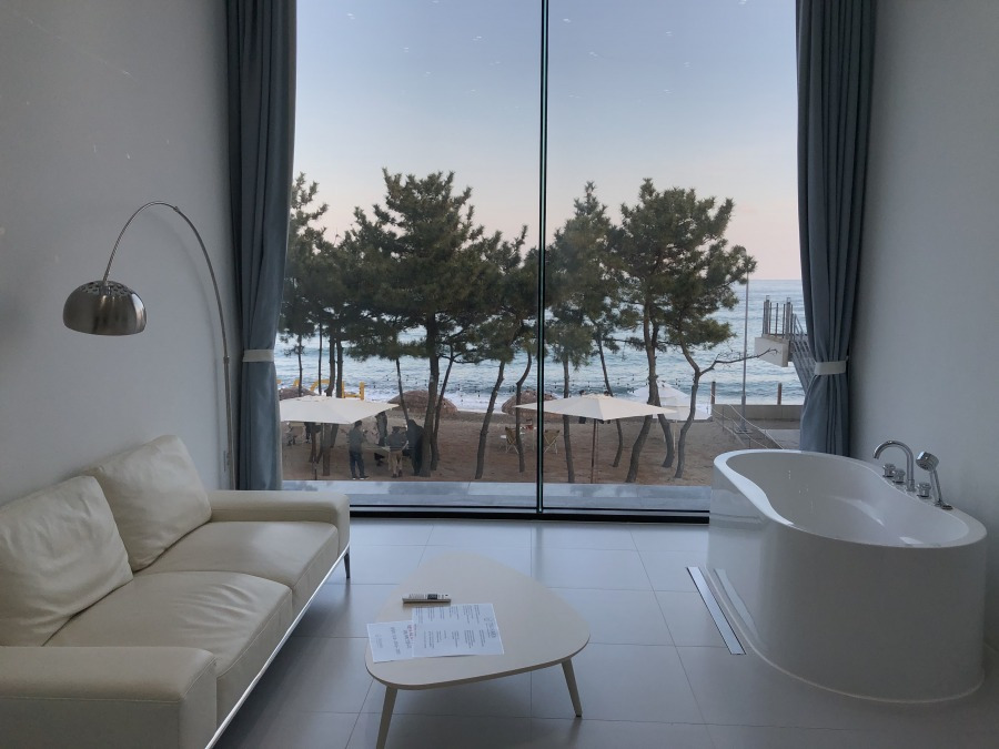 포항 더 헤이븐 리조트는 커다란 통창으로 시원하게 오션뷰를 즐길 수 있는 숙소이다. 에디터가 묵은 102호는 객실 앞의 소나무가 바다와 어우러져 아름다운 풍경을 감상할 수 있었다. 욕조가 있어 반신욕도 즐길 수 있다.