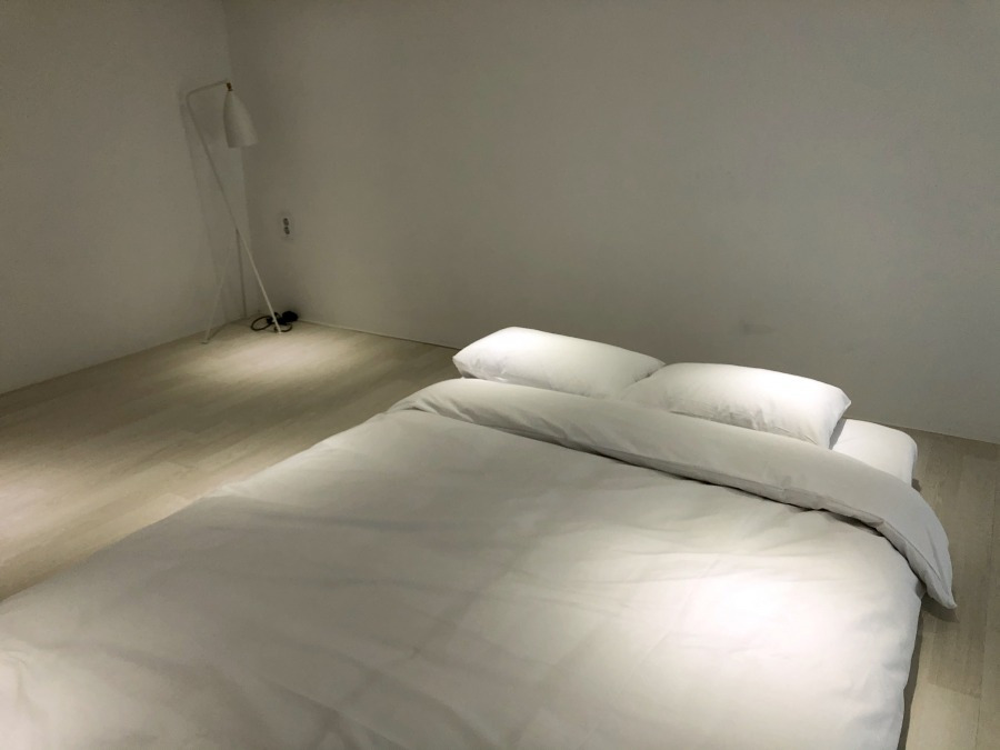 침실은 복층에 있으며 개별난방이 된다. 하지만 점등이 1층에서만 가능하다는 점은 조금 아쉽다. 복층의 천장은 키가 큰 에디터도 큰 불편함 없이 묵을 수 있을 정도로 적당했고, 여분의 침구를 두고 성인 3명이서 자도 충분할 정도로 넓었다.