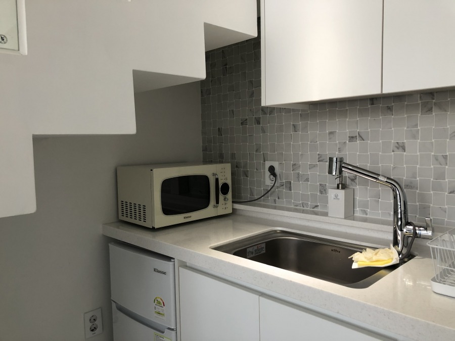 1층에는 거실과 주방, 화장실이 있다. 취사가 가능하기에 인덕션과 전기밥솥, 전자레인지, 각종 취사도구가 마련되어 있었고, 와인잔과 소주잔도 있다. 설거지 용품은 모두 일회용이라 위생적이라는 점이 좋았다. 보통 인덕션은 끓는 속도가 느린 경우가 많은데 더 헤이븐 리조트의 인덕션은 엄청 빨리 끓어서 마음에 쏙 들었다. 생수는 따로 비치되어 있지 않으니 미리 구매하거나 1층의 카페를 이용하면 된다.