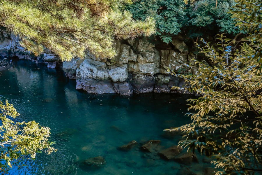 호텔에서 차 타고 10분이면 충분한 쇠소깍! 양 벽에 기암괴석이 병풍처럼 둘러서 있고, 그 위로 숲이 우거져 있어 신비한 계곡에 온 기분이다. 산책로를 따라 계속 내려가면 검은 모래로 유명한 쇠소깍 해변에 도착할 수 있다.