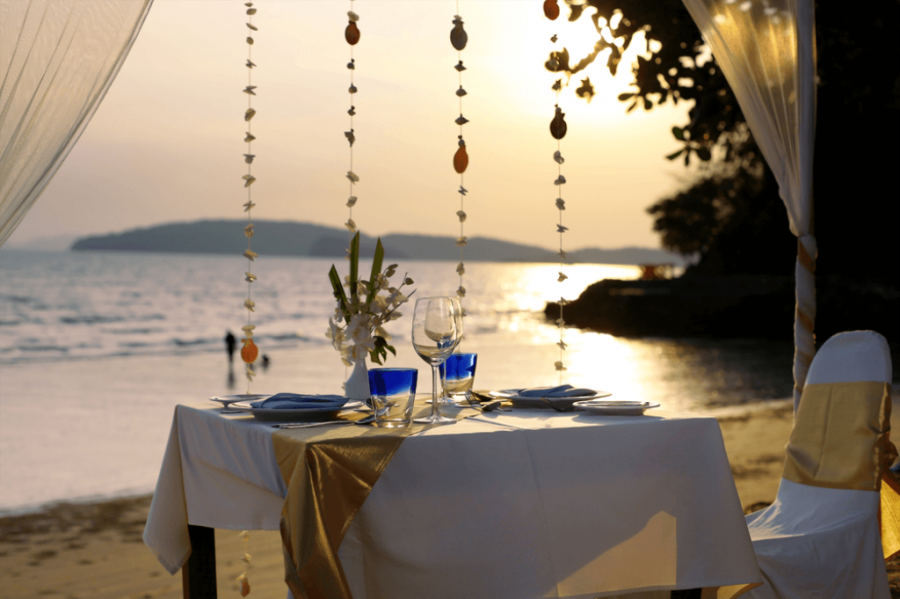 로맨틱의 끝판왕! 분위기 넘치는 끄라비 리조트의 야외 해변 레스토랑. 신혼부부도 연인도 더욱 사랑에 빠지게 만드는 리조트 전용해변과 그 모래사장에 테이블이 준비 된다. 하얀색 테이블에 비치는 붉은 석양까지! 모든 것이 완벽한 프라이빗 레스토랑이다.