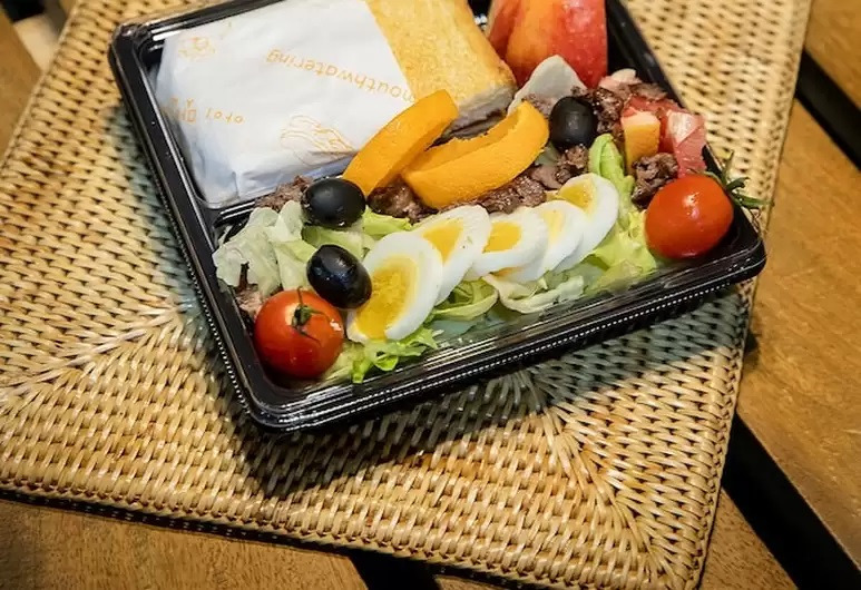 조식은 룸서비스로 아침 8시 30분에서 9시 30분 사이에 제공된다. 음료와 함께 도시락 형태로 제공돼서 객실과 라운지, 해변 등 어디서든 즐길 수 있다. 샌드위치 세트로 샐러드와 과일도 제법 알차게 채워져 있다.