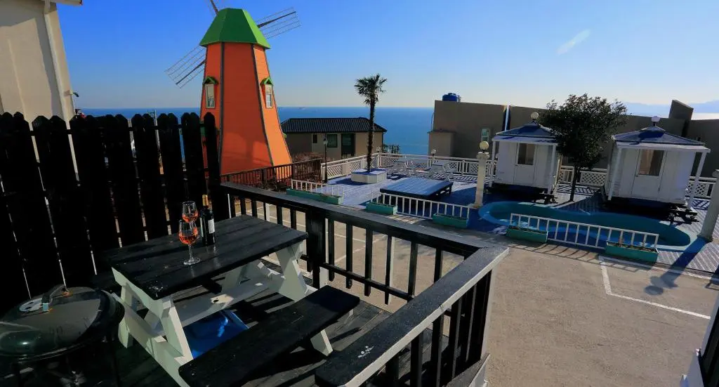 그리드 1398 펜션에서 돋보이는 점은 독특한 디자인의 온수풀이다. 바다를 보며 즐길 수 있어, 방문객들에게 인기 만점이다.