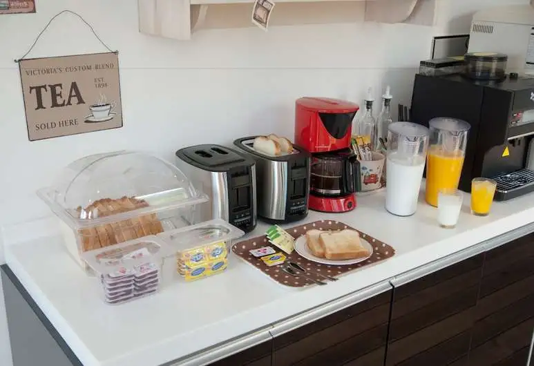 조식으로는 커피와 차, 빵, 잼, 우유, 주스 등이 준비되어있다. 조식이 화려하기보단 아침에 간편하게 먹을 수 있는 것들로 구성되어 있다.