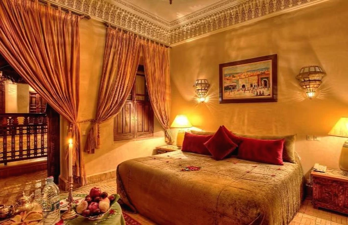리야드 크니자는 5성급 숙소로 고급스러운 인테리어 덕분에 셀럽들에게도 인기가 많은 숙소이다. 또 모로코의 화려하고 아름다운 전통 가옥을 직접 체험해볼 수 있다. 자마 알프나 광장까지 도보로 20분, 바히아 궁전까진 차로 16분정도 소요된다.