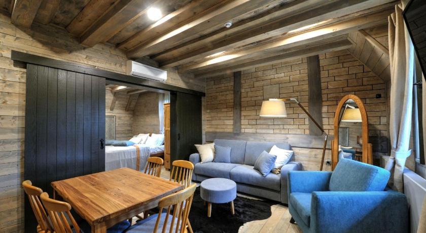 현대적이고 모던한 인테리어의 내부 모습과 대비되는 전통적인 느낌의 원목 인테리어의 벽과 바닥이 묘하게 잘 어우러지는 에스노 하우지즈 폴리트비사 셀로. 침실과 거실이 어두운 컬러의 원목 도어로 나뉘어 있어 더욱 편안한 하우스 같은 느낌을 주는 객실이다! 발코니가 있는 타입의 객실은 야외 발코니에 휴식 공간과 함께 온수 욕조가 구비되어 있어 숙소의 전경을 구경하며 쉬기에 좋다.