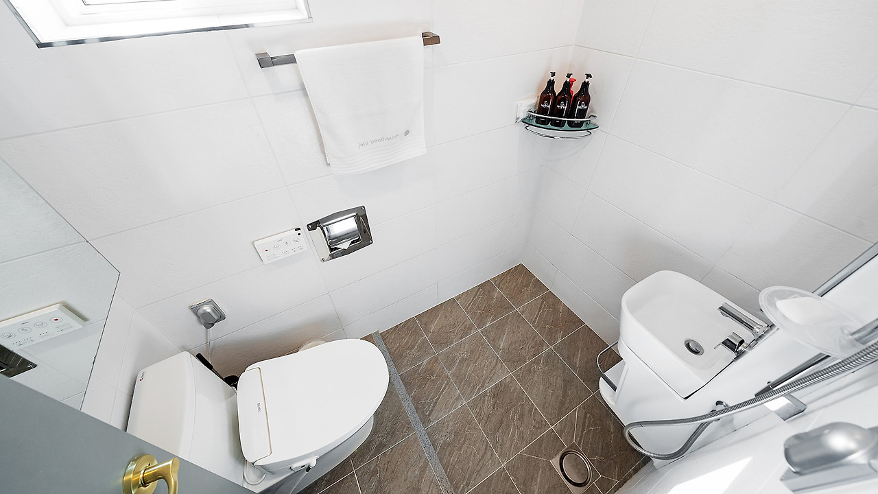 한림해안로 바로 앞에 위치한 벨롱하우스는 전 객실에서 아름다운 제주 오션뷰를 감상할 수 있다. 그중에서도 빔프로젝트가 설치된 스위트 2 객실은 커플 단위 여행객들에게 단연 인기가 높다. 욕실은 다소 좁지만 알차게 구성돼 있고, 샴푸, 린스, 바디워시, 비누 그리고 헤어드라이기와 수건까지 모두 제공된다.