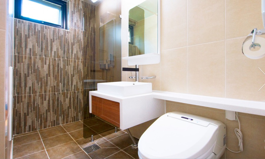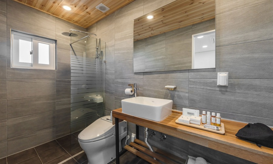 B2 욕실은 1층에 있으며, 어메니티로 샴푸와 린스, 바디워시, 바디로션, 비누, 칫솔, 치약이 빠짐없이 구비되어 있다. 그외 샤워캡과 일회용 면도기, 빗, 드라이기 등도 준비되어 있다.