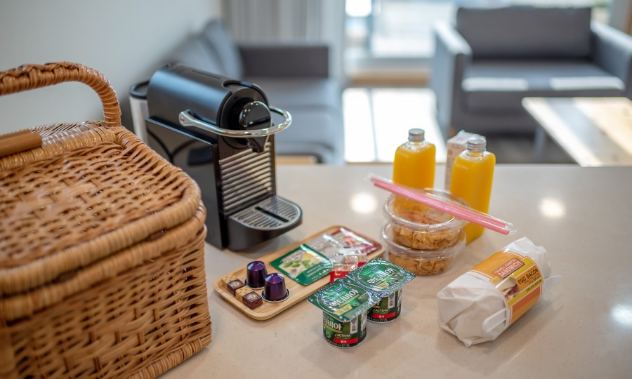 예쁜 라탄 바구니에 담아 오는 조식, 샌드위치와 시리얼, 요플레, 주스, 우유를 무료로 챙겨 줘서 든든하게 아침을 맞이할 수 있다. 웰컴서비스로 네스프레소 커피가 성인 1인당 1캡슐 무료 제공된다.
