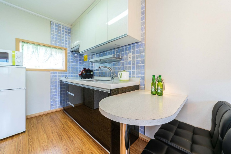 1층은 거실 겸 주방으로 사용되며 욕실과 테라스가 있다. 주방은 취사가 가능하며 냉장고와 전자렌지, 밥솥과 취사도구 등이 구비되어 있다. 그리고 생수와 맥주 등이 들어있는 미니바를 무료로 이용할 수 있다.