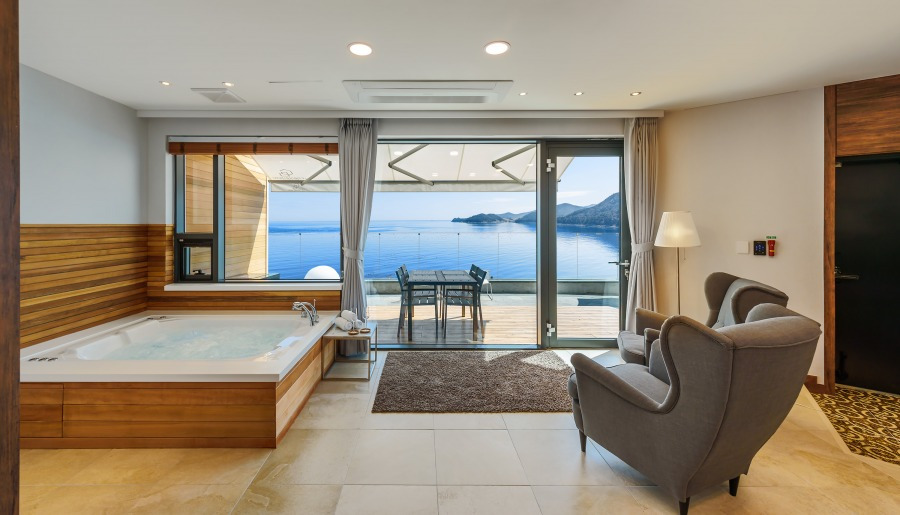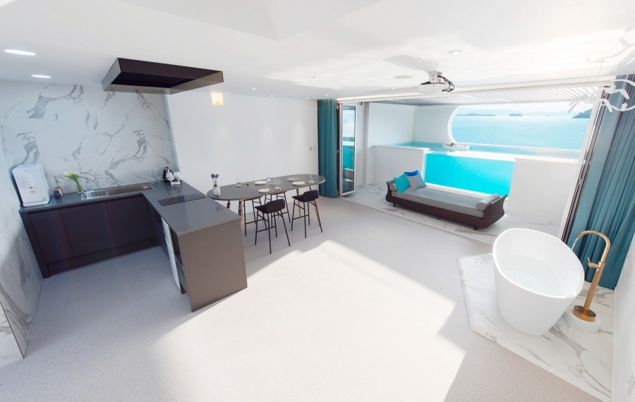 객실 내에는 홈씨어터 시설이 완비되어 있어 영화 감상을 즐길 수 있다. 프라이빗한 오션뷰 전용 발코니에서는 인생샷을 남길 수 있는 것은 물론이고, 바비큐도 즐길 수 있다.