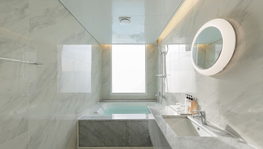 욕실에는 여유롭게 오션뷰를 즐길 수 있는 욕조가 있으며, 어메니티는 샴푸와 린스, 바디워시, 칫솔, 치약, 비누가 구비되어 있다.